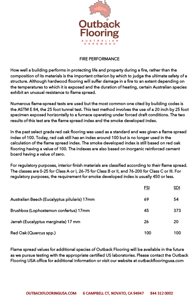 Code requirements for wood interior finish materials are expressed in terms of flame spread index numbers. These values are determined in a standard fire test which evaluates the surface burning characteristics of a material. Several native Australian timber species perform remarkably well on these tests.